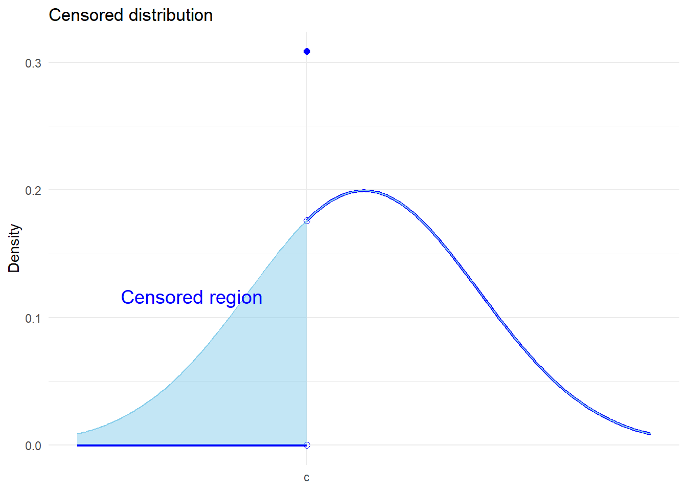 annotate("text", x = c*3, y = 0.1, label = "Censored region", vjust = -1, hjust = 0.5, size = 5, color = "blue")