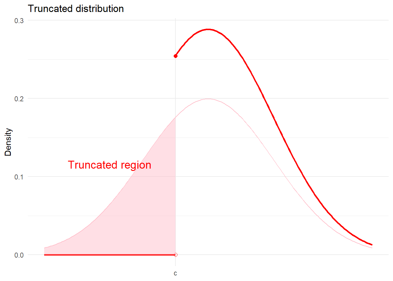 The following, is an example of a distribution that is left-truncated. We only observe values of \(Y\) for \(Y\geq c\). The density of a left-truncated random variable is,